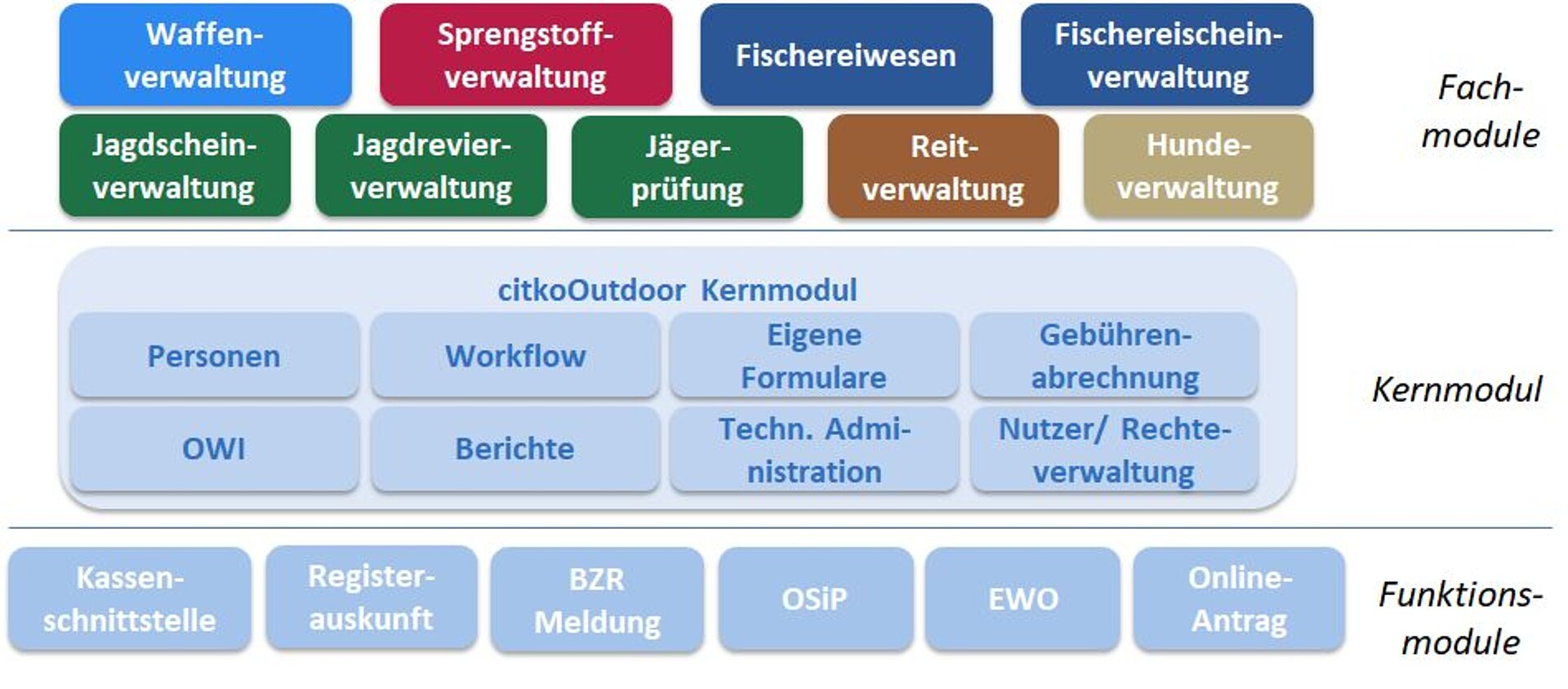 Die Fachmodule bilden die Spezifika der Verwaltungsbereiche und konkrete Geschäftsvorfälle ab (z. B. die Verwaltung von Sprengstofferlaubnissen oder Jagdscheinen).