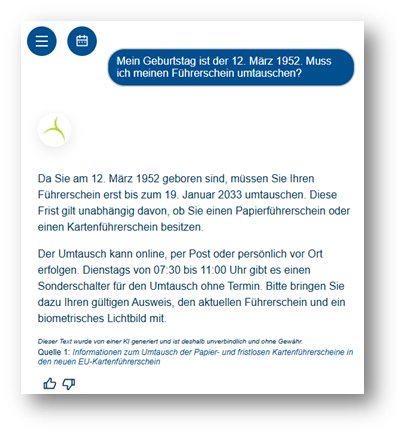 Die Sprachmodelle der Chatbots kennen die Webseite und andere veröffentlichte Dokumente der Fachämter. Darum können die Chatbots Fragen in natürlicher Sprache beantworten. Als intelligente digitale Auskunftsassistenten stehen Sie Bürgerinnen und Bürgern jederzeit und unabhängig von den Öffnungszeiten und Besetzung der Telefonhotline für ihre Fragen zur Verfügung.